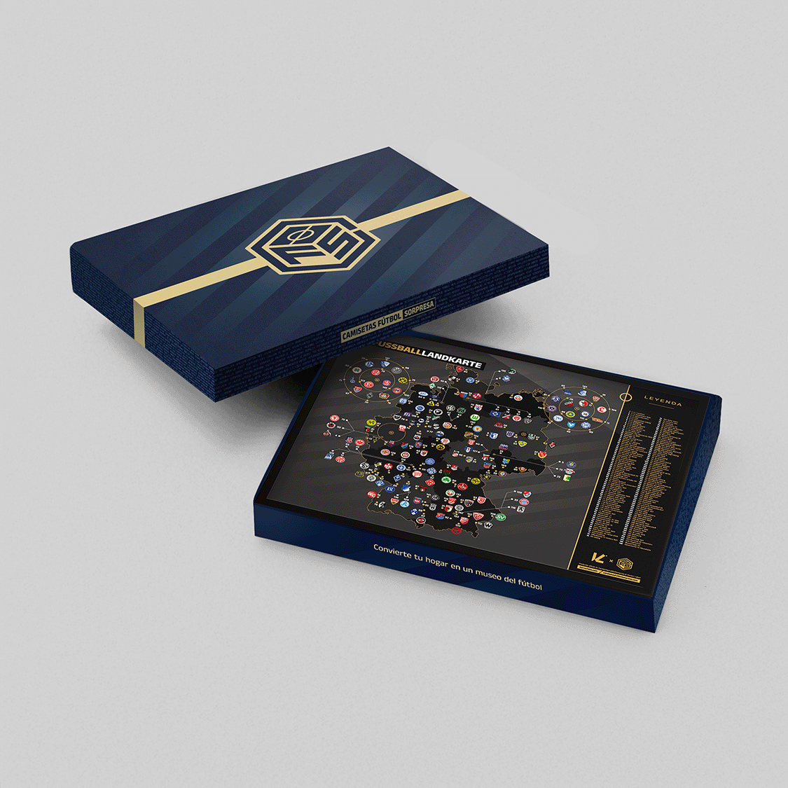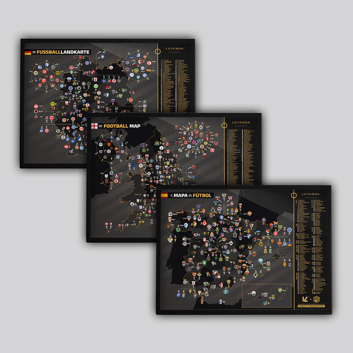 Incluye 3 mapas de 40x30 cm, cada uno enmarcado y presentado en una caja personalizada. Cada mapa representa una de las 3 grandes ligas europeas: España, Inglaterra, Italia, Francia y Alemania y reúne a más de 350 equipos más importantes de esos países.