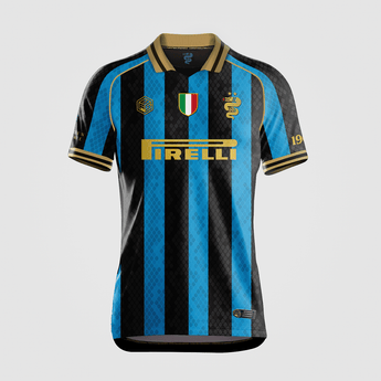 Esta edición especial rinde tributo a las icónicas franjas azul y negro, reinterpretadas con nuestro estilo único y un escudo rediseñado que le aporta carácter. En el pecho luce el Scudetto en el centro y la ya mítica publicidad Pirelli, símbolos que marcaron una época. En mangas el año de fundación y las coordenadas de la localización de su estadio.