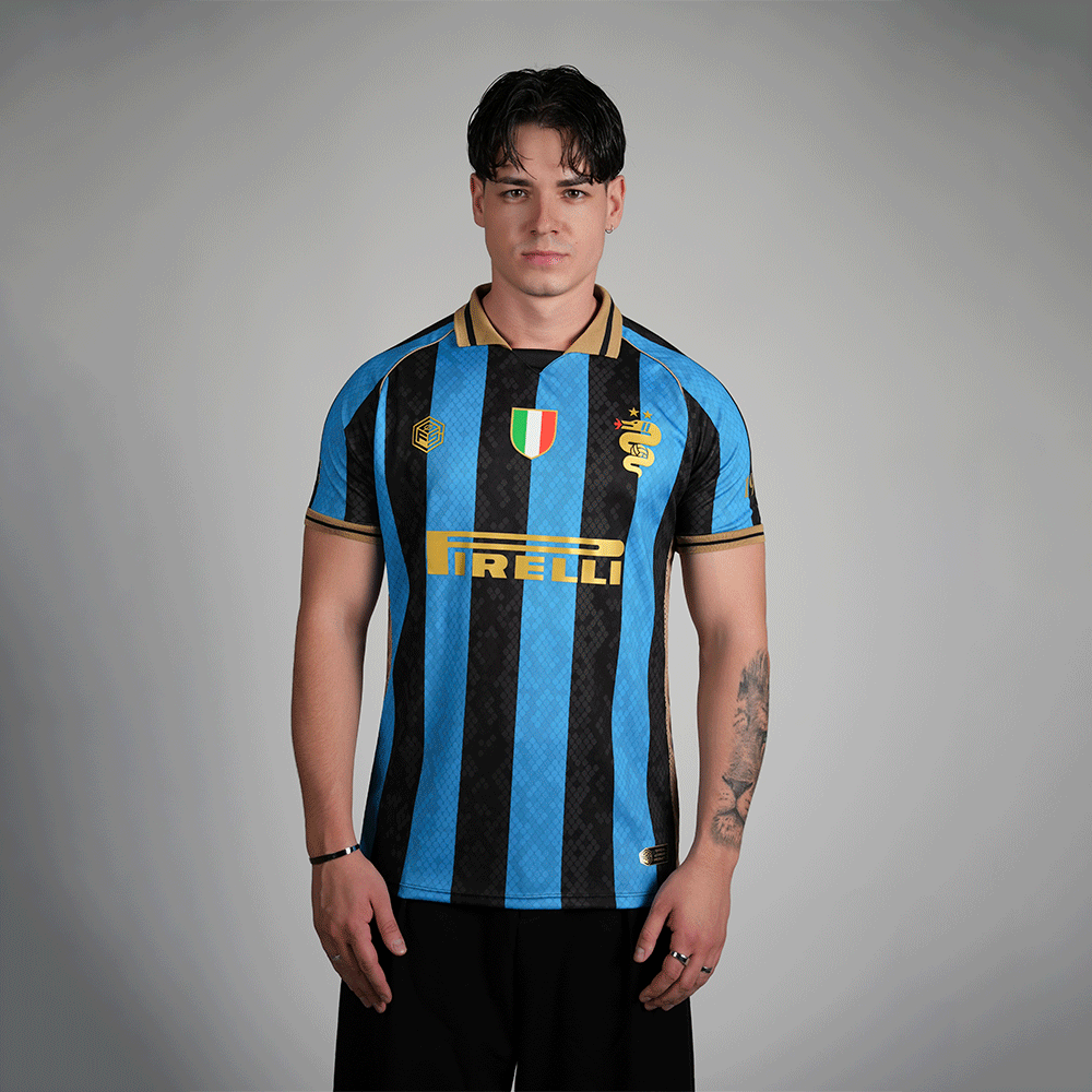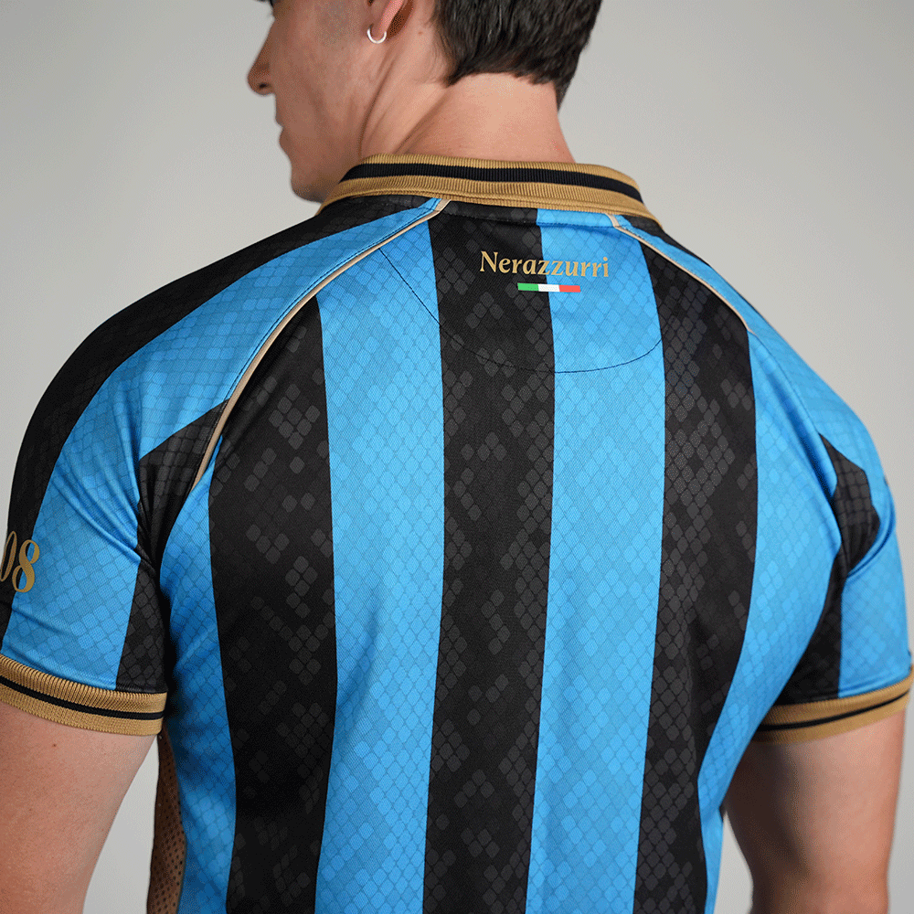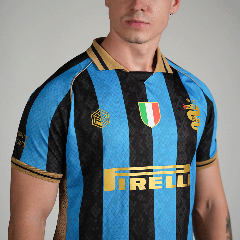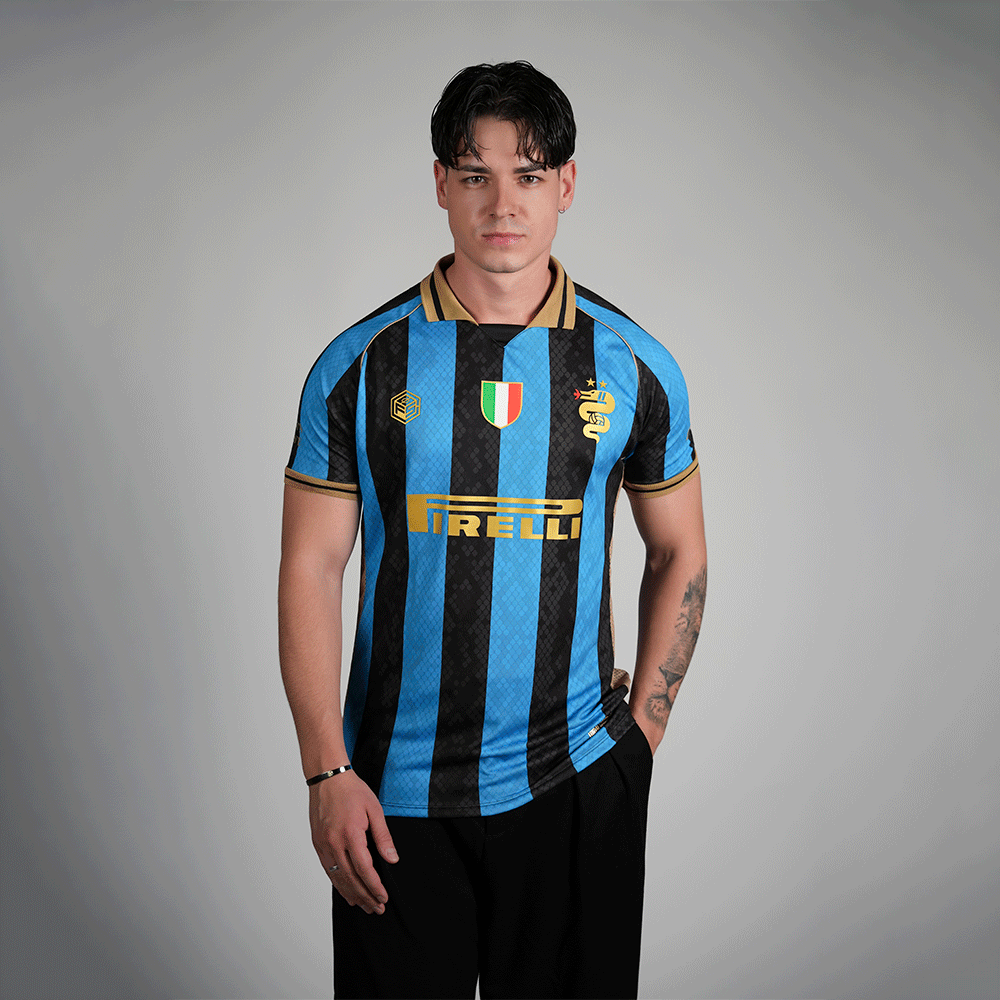 This special edition pays tribute to the iconic blue and black stripes, reinterpreted with our unique style and a redesigned crest that adds character. The Scudetto is prominently displayed on the chest, along with the legendary Pirelli sponsor logo, symbols that defined an era. The sleeves feature the founding year and the coordinates of the stadium's location.