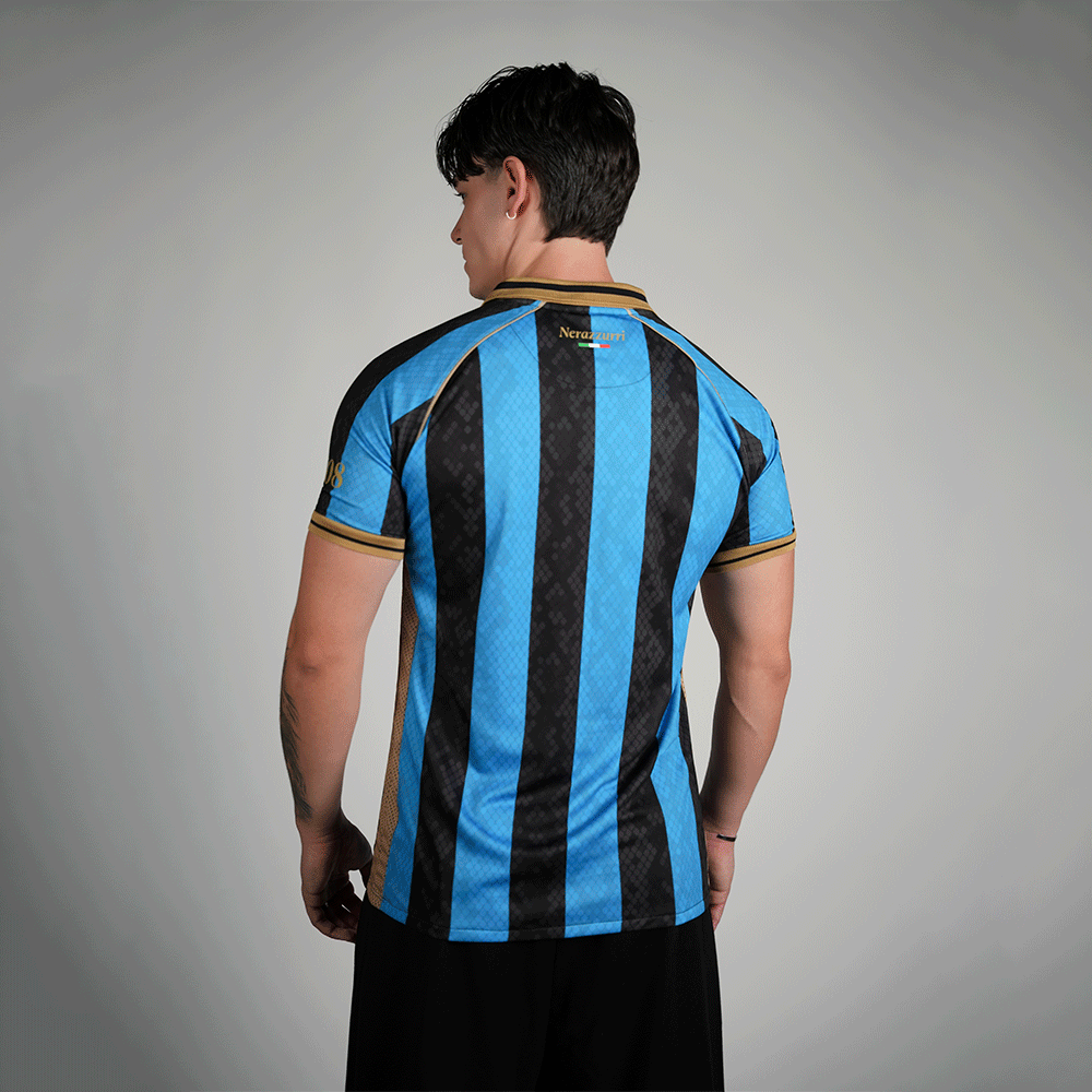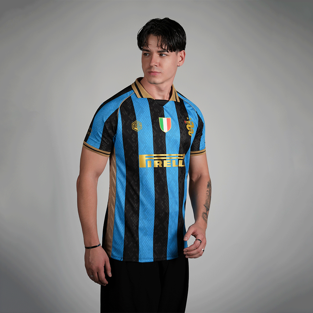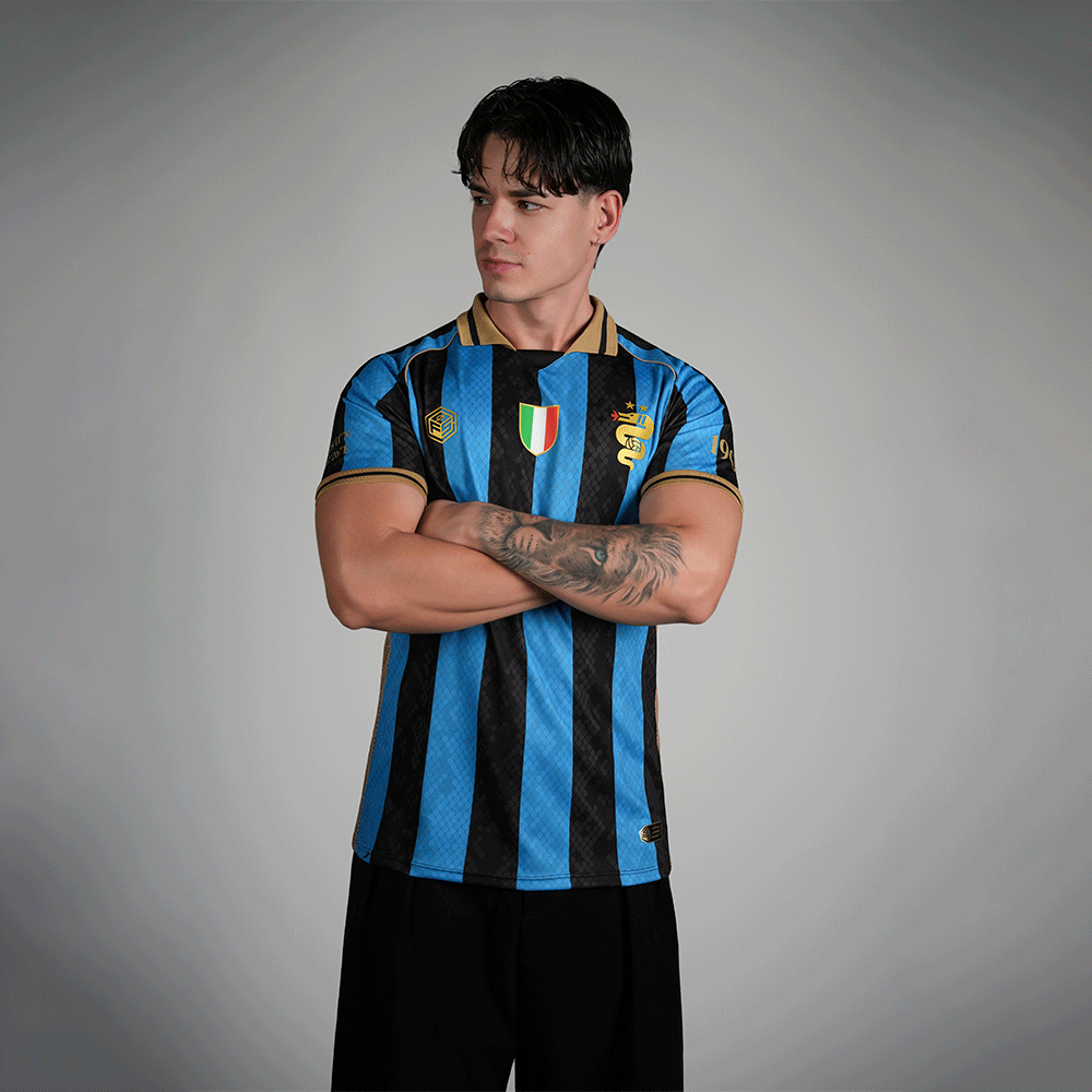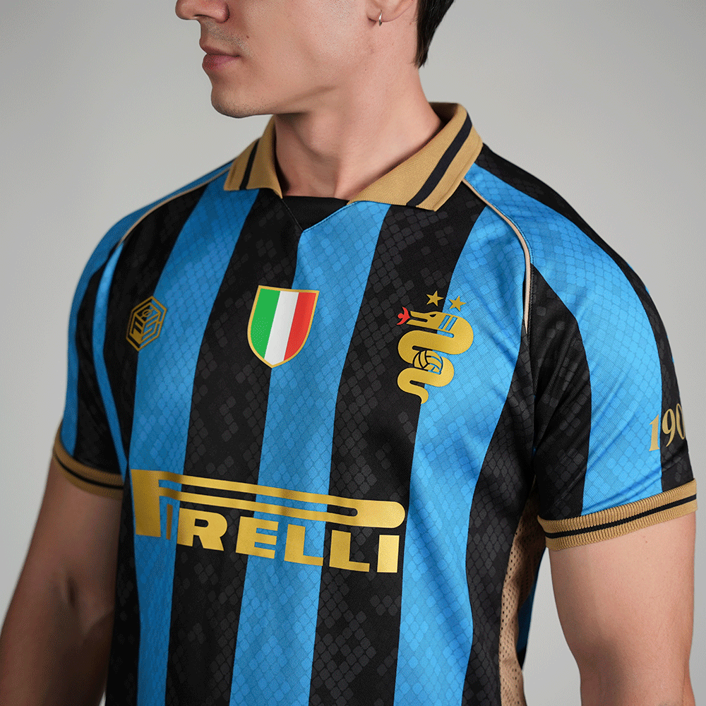 This special edition pays tribute to the iconic blue and black stripes, reinterpreted with our unique style and a redesigned crest that adds character. The Scudetto is prominently displayed on the chest, along with the legendary Pirelli sponsor logo, symbols that defined an era. The sleeves feature the founding year and the coordinates of the stadium's location.