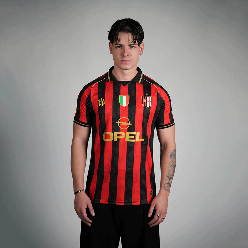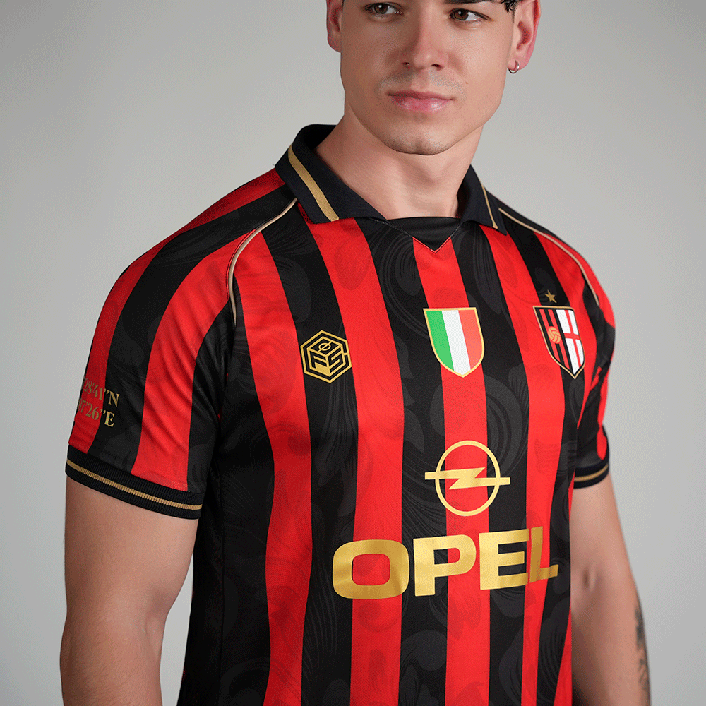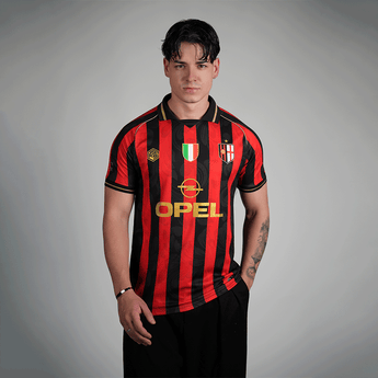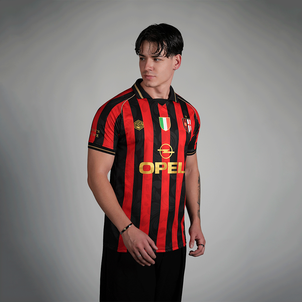 This special edition pays tribute to the classic red and black stripes, reinterpreted with our unique touch and a redesigned crest that adds character. The Scudetto is prominently displayed in the center of the chest, along with the iconic Opel sponsorship, a symbol of the club's golden era. The sleeves feature the founding year and the coordinates of the stadium's location.
