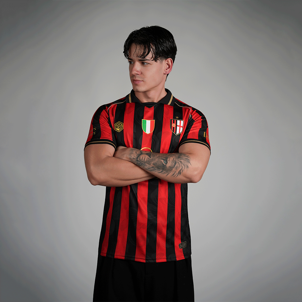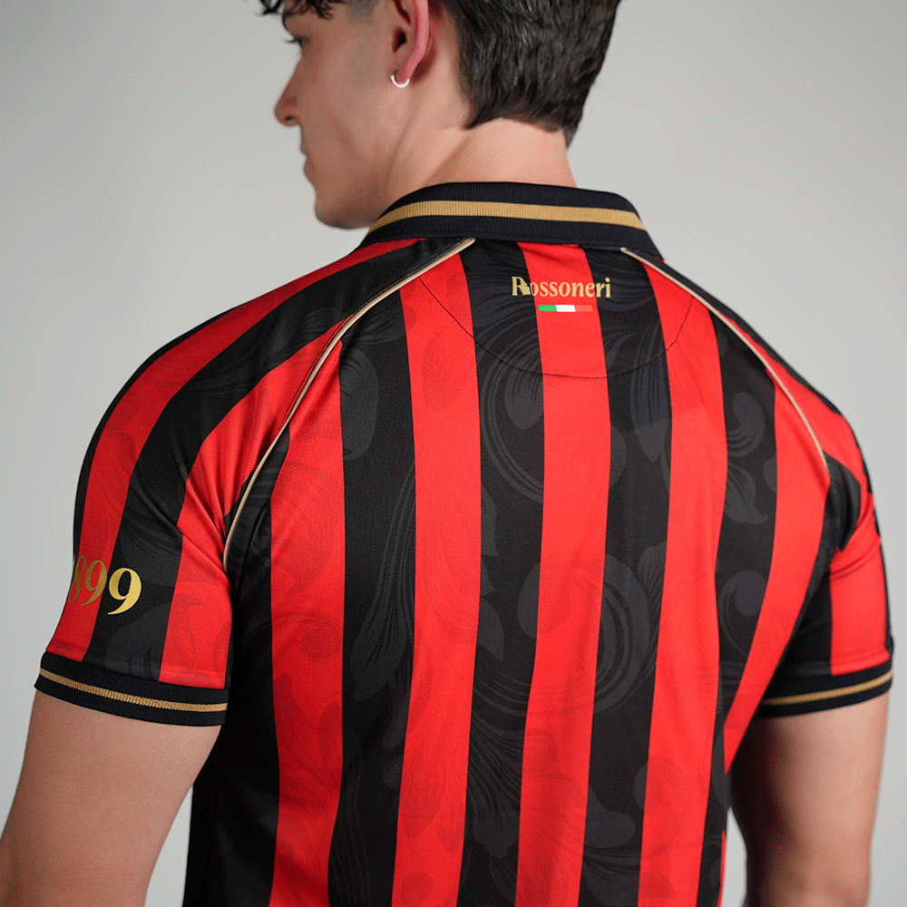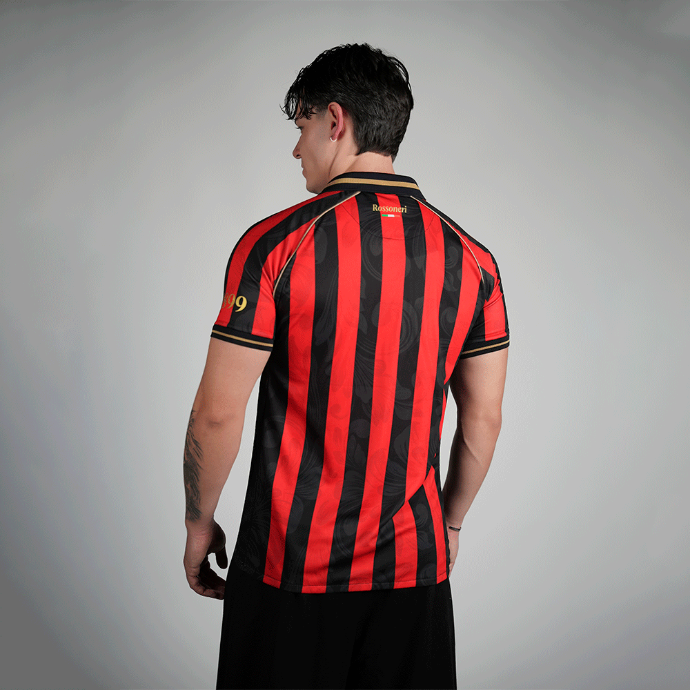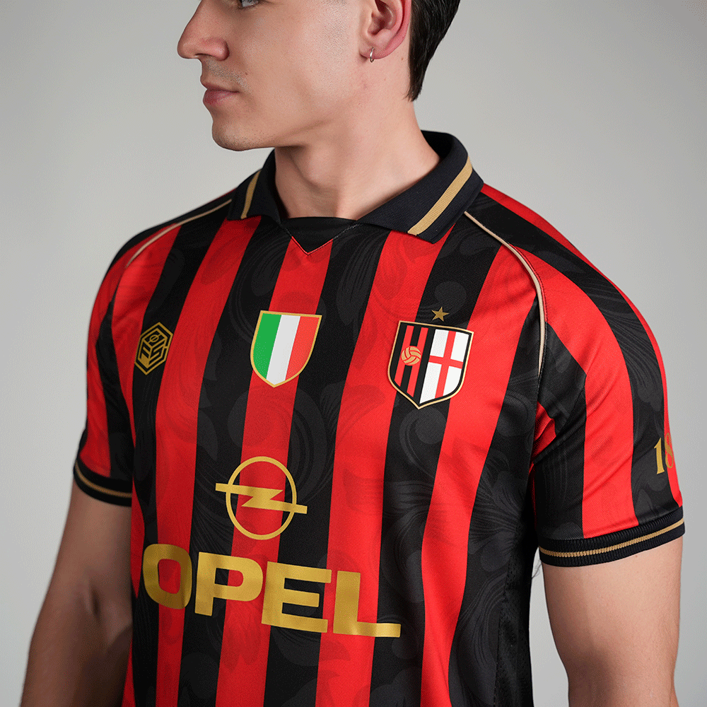This special edition pays tribute to the classic red and black stripes, reinterpreted with our unique touch and a redesigned crest that adds character. The Scudetto is prominently displayed in the center of the chest, along with the iconic Opel sponsorship, a symbol of the club's golden era. The sleeves feature the founding year and the coordinates of the stadium's location.