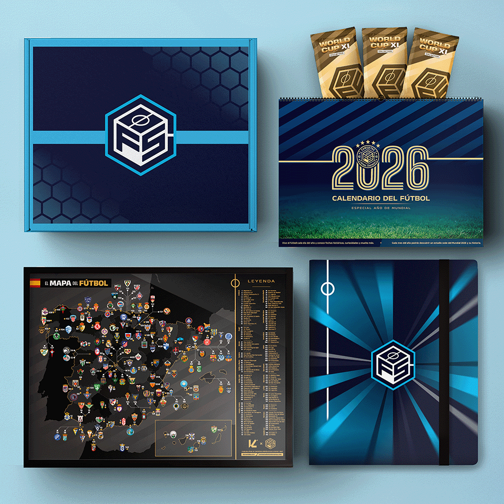 It includes a complete premium adult surprise box , a framed map of Spain with all the country's top teams, 9 surprise cards (loose or in envelopes) , a 2026 World Edition calendar with dates and fun facts, and a sticker album to start your collection.
