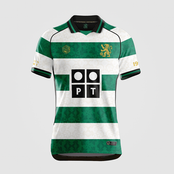 Esta edición especial rinde tributo a las clásicas franjas verdes y blancas, reinterpretadas con nuestro sello único y un escudo rediseñado que aporta fuerza y personalidad. En el pecho destaca la icónica publicidad PT, símbolo de una de las épocas más recordadas del club lisboeta. En mangas el año de fundación y las coordenadas de la localización de su estadio.